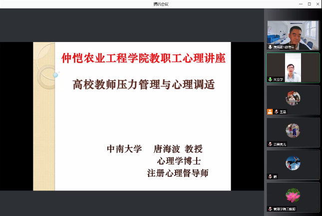 为进一步增强广大教职工热爱生活和爱岗敬业意识,树立乐观向上、健康阳光的积极心态,以良好的情绪状态投入教育教学工作,增强教师的职业幸福感,营造更加和谐愉快的育人环境,6月27日,学校在线上举办仲师大讲堂第十八讲之《高校教师心理健康》专题讲座,邀请中南大学唐海波教授作题为《高校教师压力管理与心理调适》的主题报告,会议由副校长朱立学主持,近400名教职工全程参与。