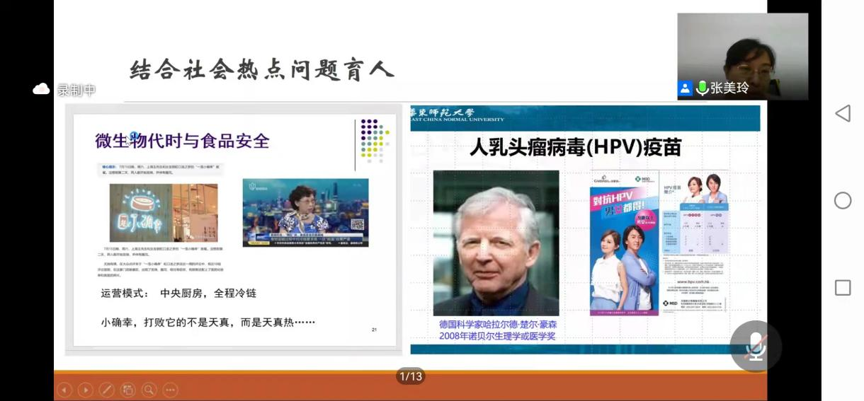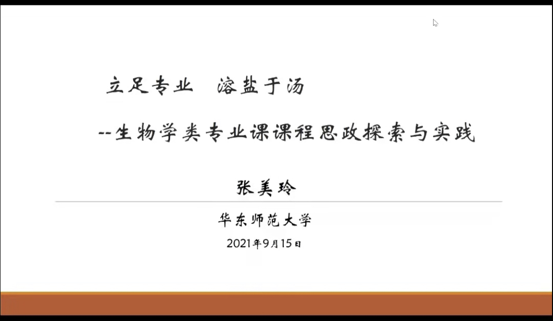 9月15日晚,“学党史 悟思想 重师德 强师能”课程思政教学能力提升系列培训第四期在线上举行,会议邀请华东师范大学生命科学学院博士生导师张美玲教授作题为“立足专业 溶盐于汤——生物学类专业课课程思政的探索与实践”专题培训。本次培训由党委教师工作部、教师发展中心主办,农业与生物学院党委承办,会议由农业与生物学院党委书记陈丹雄主持。