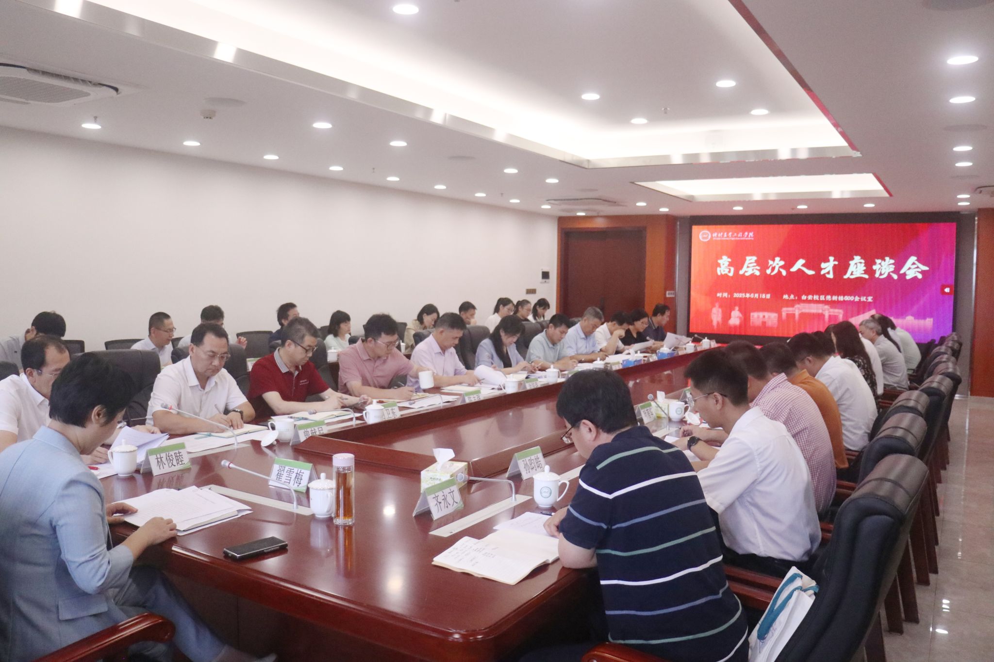 在教育强国战略深入推进、学校迈向新发展阶段的关键时期,学校于6月18日在白云校区德新楼600会议室召开高层次人才座谈会。学校党委书记翟雪梅出席会议并讲话,学校党委常委、副校长林俊睦主持会议,12位高层次人才代表与15个职能部门主要负责同志齐聚一堂,以人才为引擎,共商学校高质量发展大计。