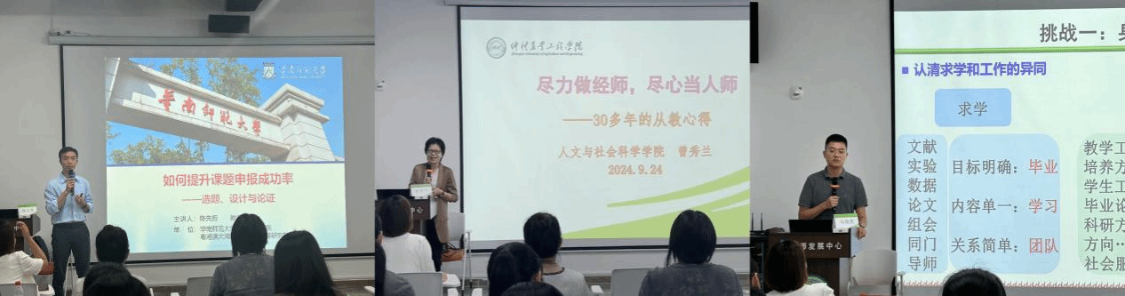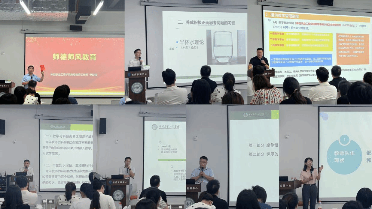 9月24日上午,华南农业大梁晓欢教授作《教学规范与教学设计的协同进阶:教学创新设计与实施》专题报告。梁晓欢以问题为导向,围绕“四新”背景下为什么要上这门课、课程面向谁、如何上好这门课等“教学十问”向大家讲述了如何上好一门课。广州国家农业科创中心主任刘玉涛研究员作《科研、科技、产业融通技巧与创新》专题报告,他以亲身经历向大家讲述了自身探索科研、科技、产业融通的技巧及创新的心路历程,向老师们展示了一路走来的艰辛奋斗历程以及如何胸怀国之大者走好科研之路。下午,明胜m88官网轻工食品学院马路凯副教授以自身亲身经历向大家讲述了自己如何从一名博士生转变为教书育人的教师。他向大家分享了自己入职五年内所应对的身份转变、身份认同、如何站稳讲台、如何处理教学与科研的关系等各类挑战的心路历程。明胜m88官网人文与社会科学与学院曾秀兰教授作《尽力做经师,尽心当人师》专题报告。她结合自身30多年的从教经历,从目标与行动力、做事与做人、权利与性格等方面讲述了如何做一名经师和人师结合的好教师,让在场教师们深受启发。华南师范大学教育科学学院教授陈先哲作《如何提升课题申报成功率》专题报告。他从课题申报者和评审者的双重身份出发,结合切身体验和各种案例,分享了课题申报的术与道。从选题、研究论证、研究内容、研究思路、创新之处等方面对课题申报的全流程进行了全方位讲解。